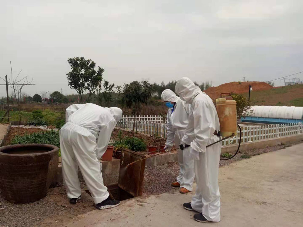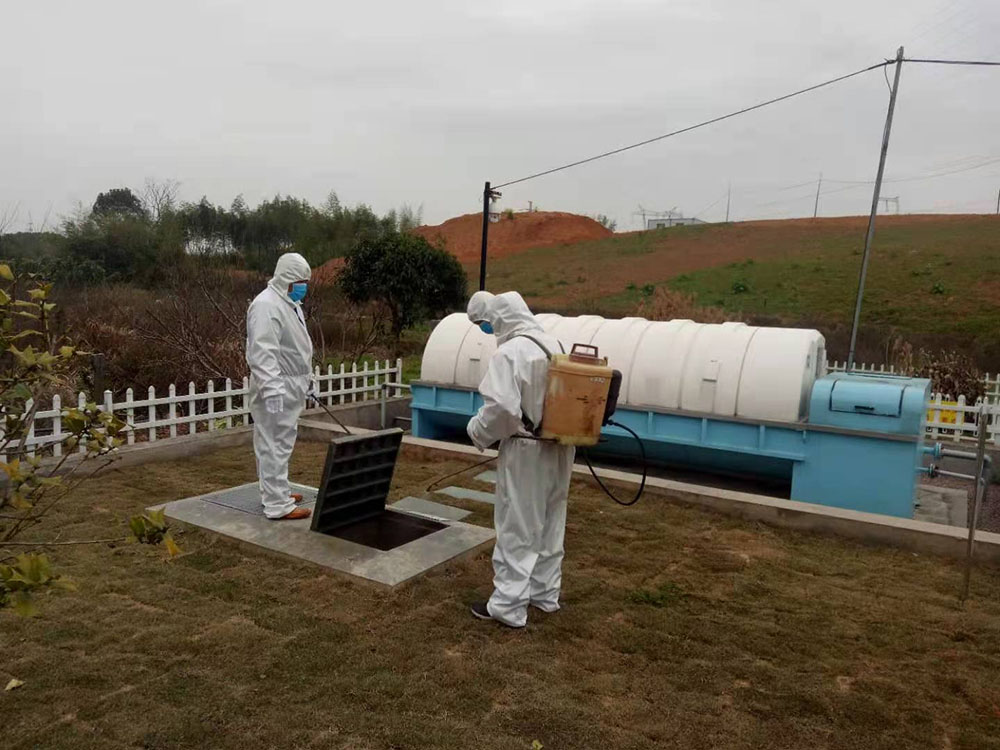 | 科然環(huán)境運(yùn)維組員工為號召國家防控疫情政策,對各個終端和管網(wǎng)的污水池進(jìn)行全面的清掏、消殺工作。 |